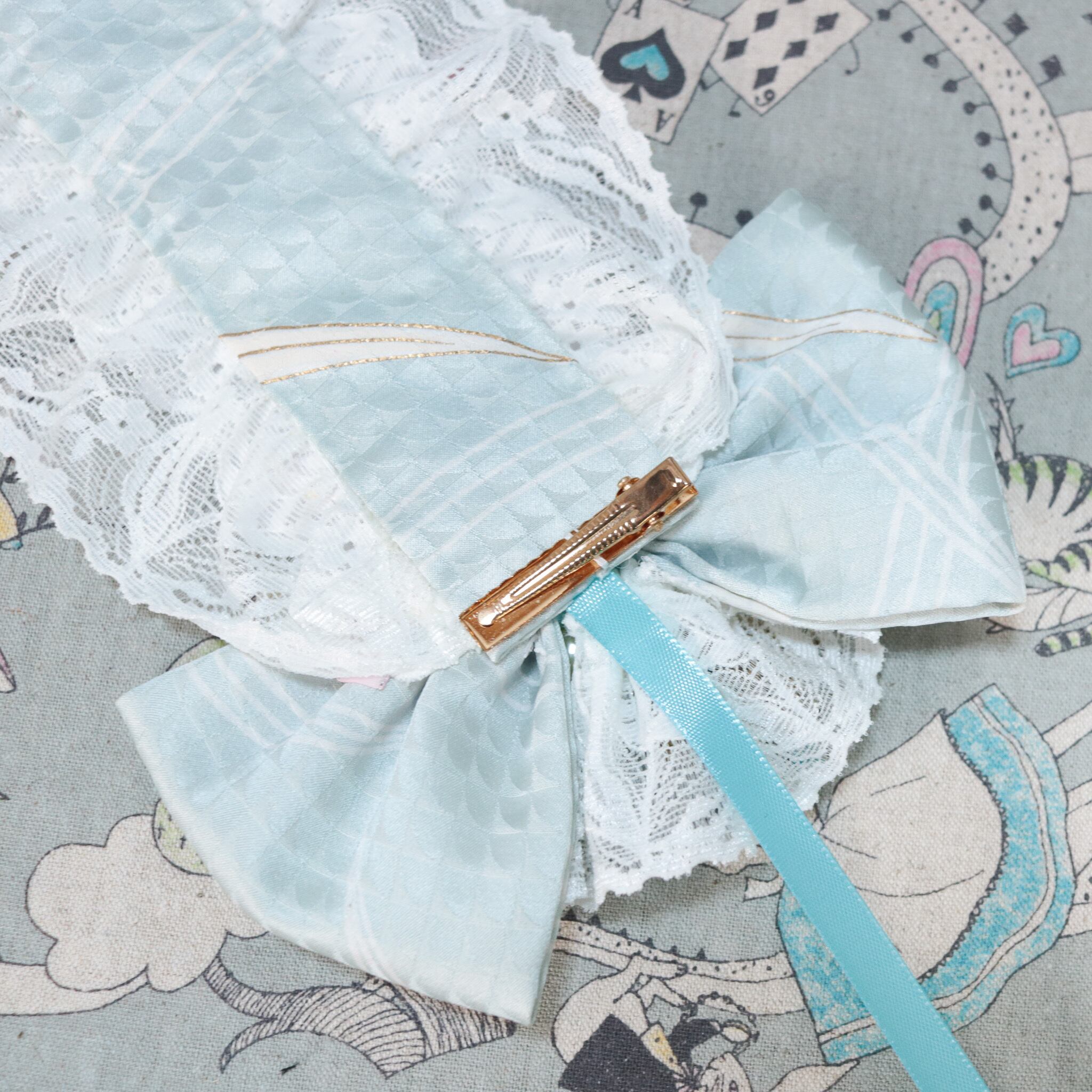 裏側に、取外し可能なクリップ(金属アレルギーの方は取り外してお使い下さい)と、顎紐リボンの両方でしっかり固定されますので、強風の日も安心です。