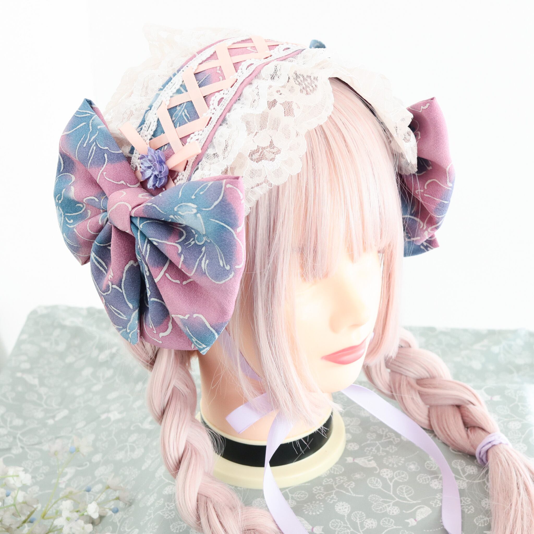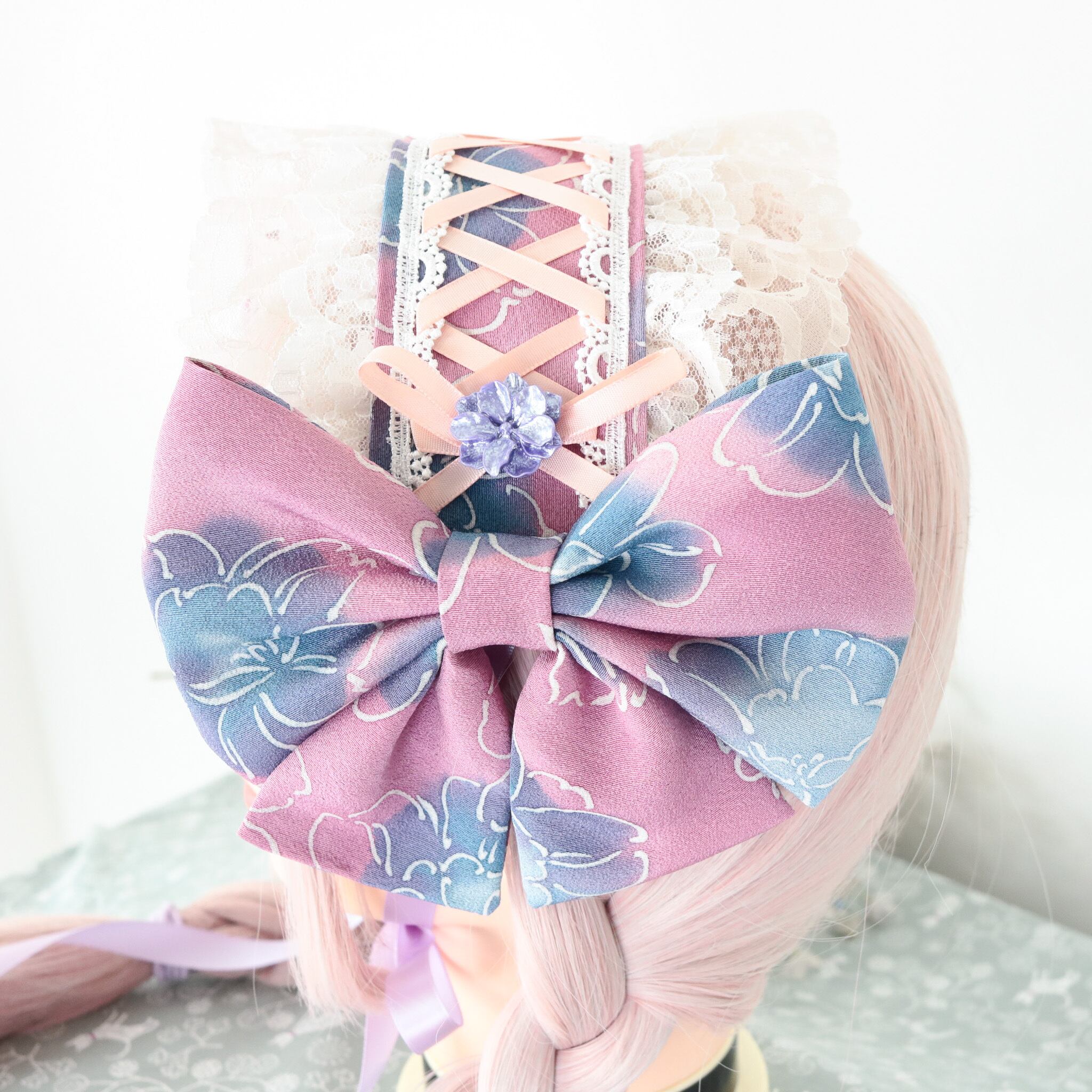 着物 リメイク 和風 和服 和装 ロリータ ロリィタ 洋服 袴 ヘッドドレス ボンネット ハーフボンネット 帽子 和洋折衷 一点物 リボン レース フリル 和柄 アクセサリー 和ロリ クラロリ 創作 撮影 日本 ゆめかわ 地雷 成人式 卒業式 入学式 式典 ライブ ライバー ユーチューバー イベント アイドル コンサート コンカフェ 豪華 お茶会 lolita kimono コスプレ パープル ブルー セール 特別価格 Happinyass