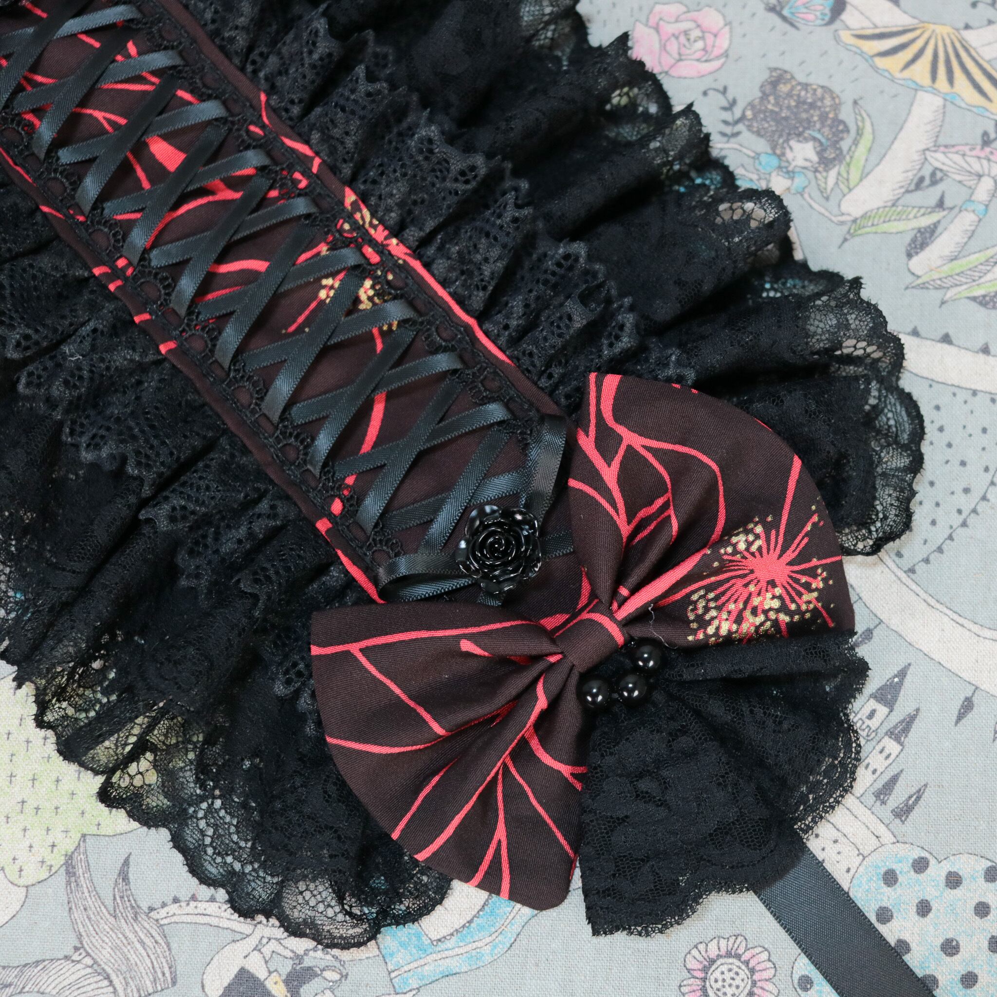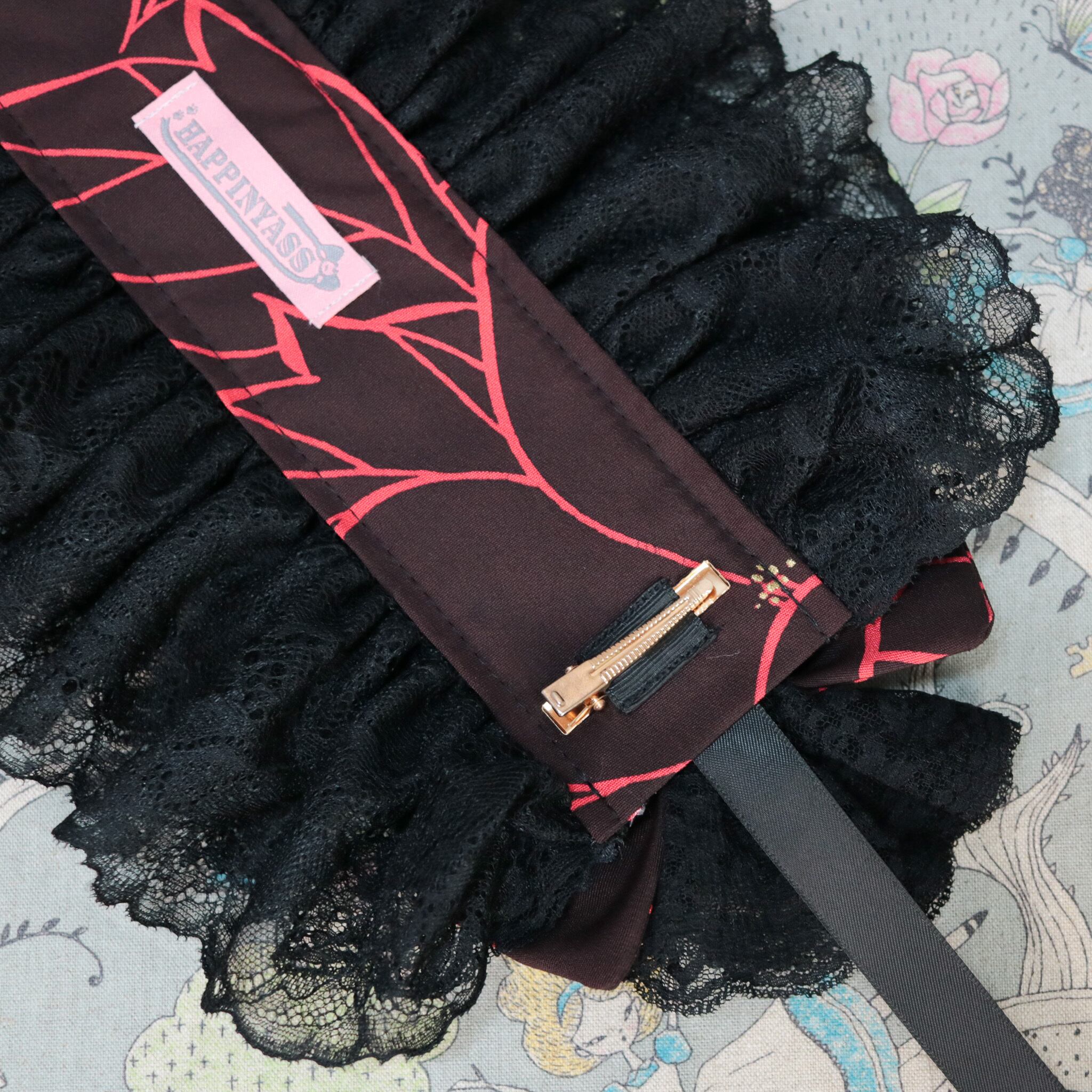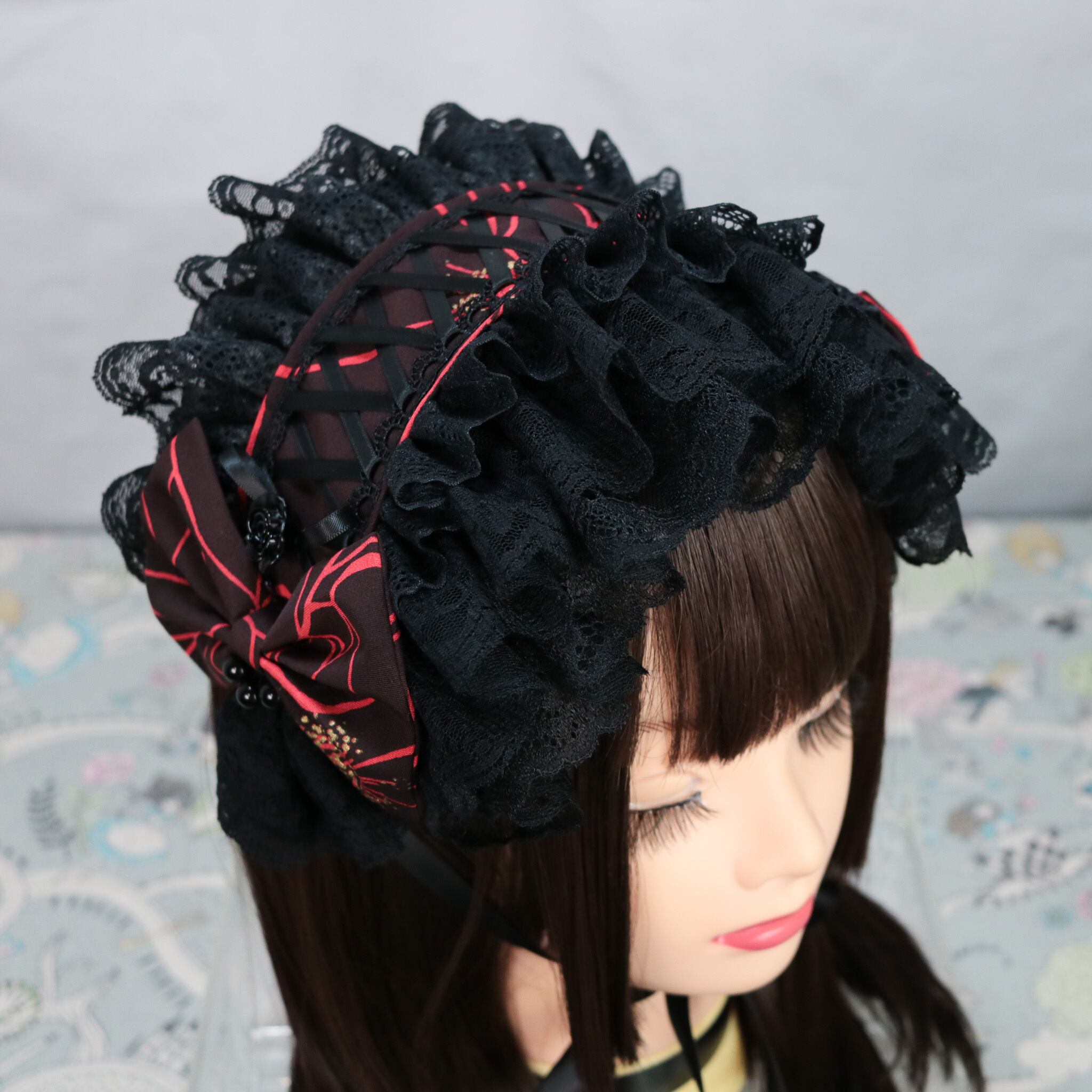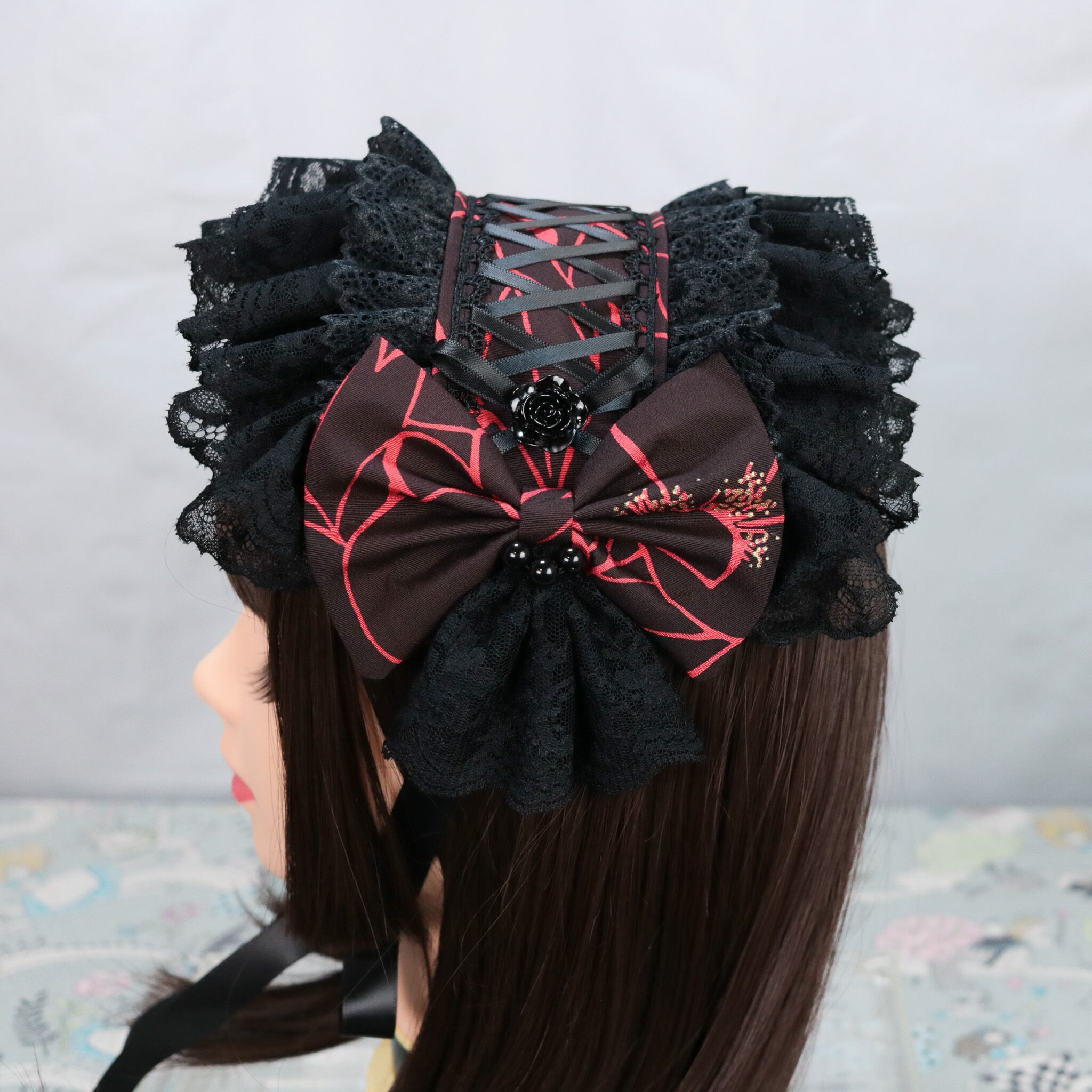 ヘッドドレスサイズになると椿の柄は分からなくなりましたが、和ゴスにぴったりな雰囲気のヘッドドレスです。