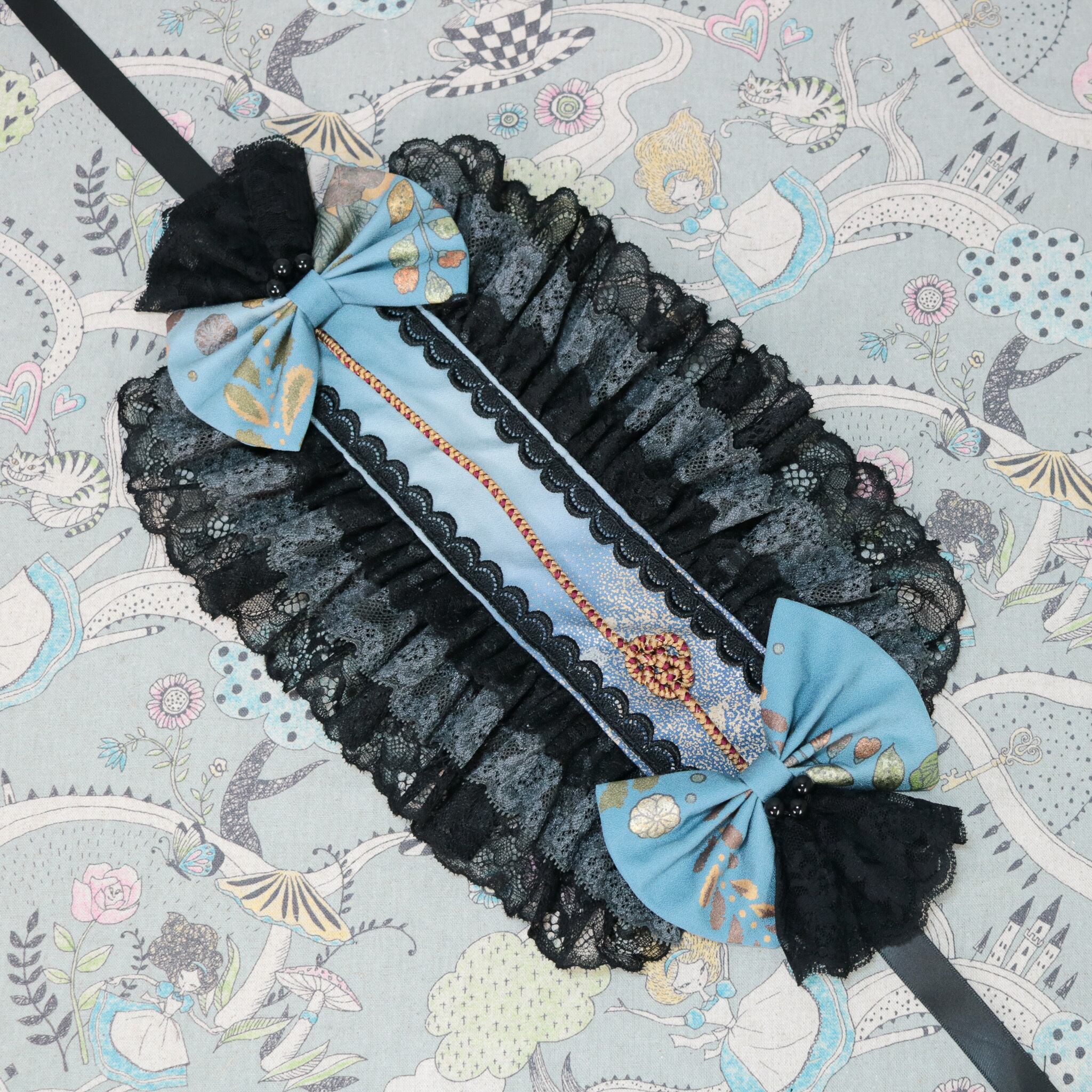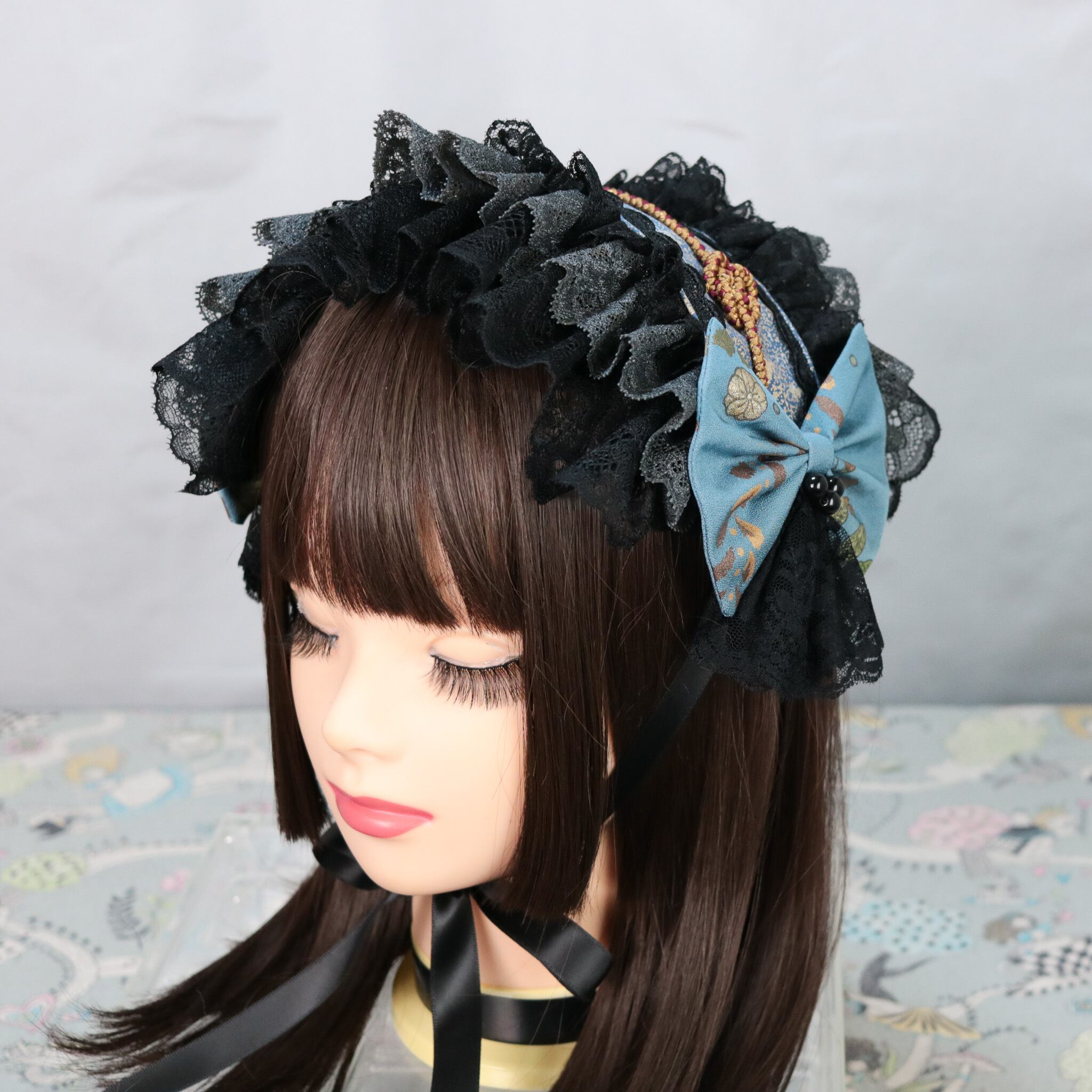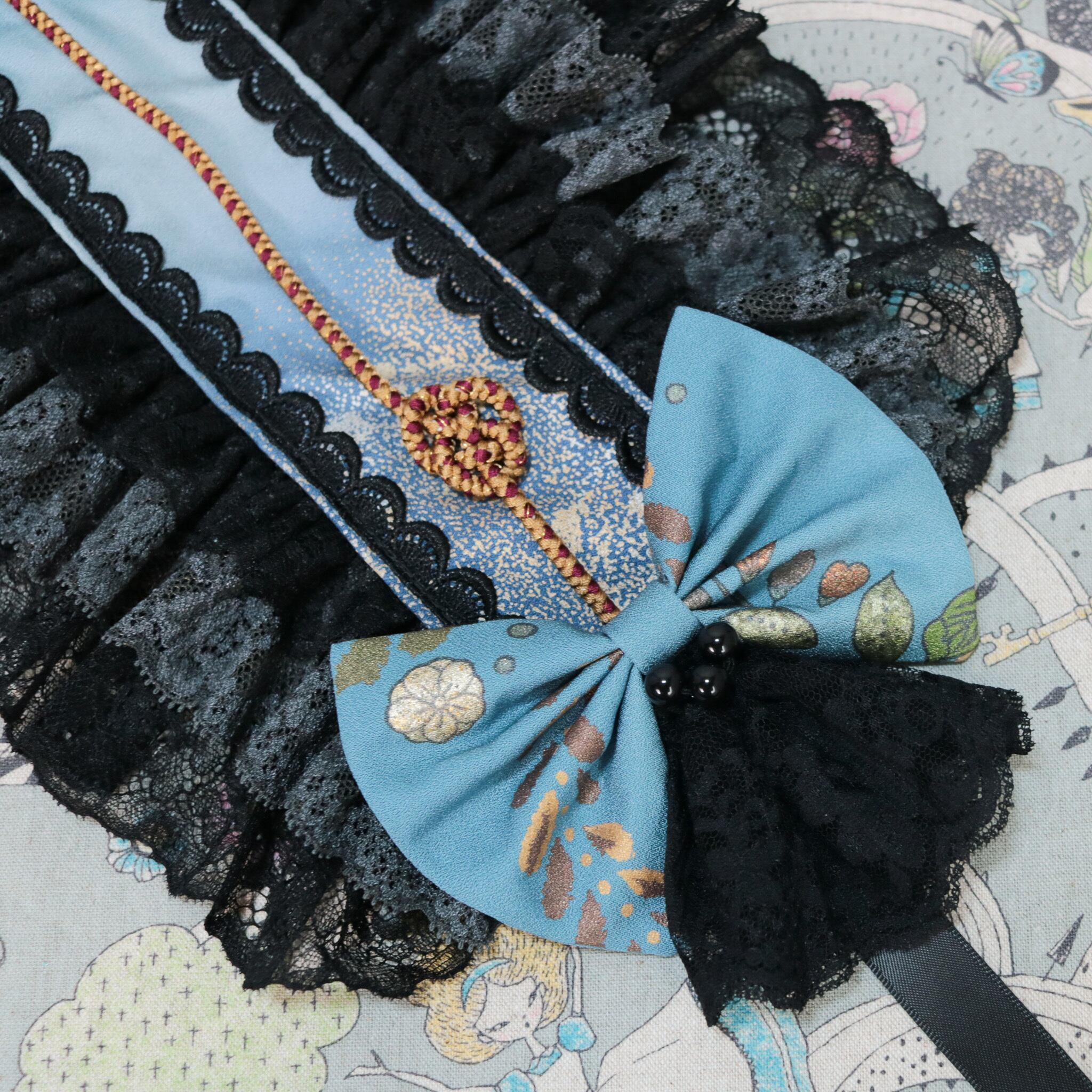 着物 リメイク 和風 和服 和装 ロリータ ロリィタ 洋服 袴 ヘッドドレス ボンネット ハーフボンネット 帽子 和洋折衷 一点物 リボン レース フリル 和柄 アクセサリー 和ロリ クラロリ 創作 撮影 日本 浴衣 ゆめかわ 地雷 成人式 卒業式 入学式 式典 振袖 絹 シルク ライブ ライバー ユーチューバー イベント アイドル コンサート コンカフェ 豪華 お茶会 lolita kimono 青 ブルー 黒 ブラック Happinyass