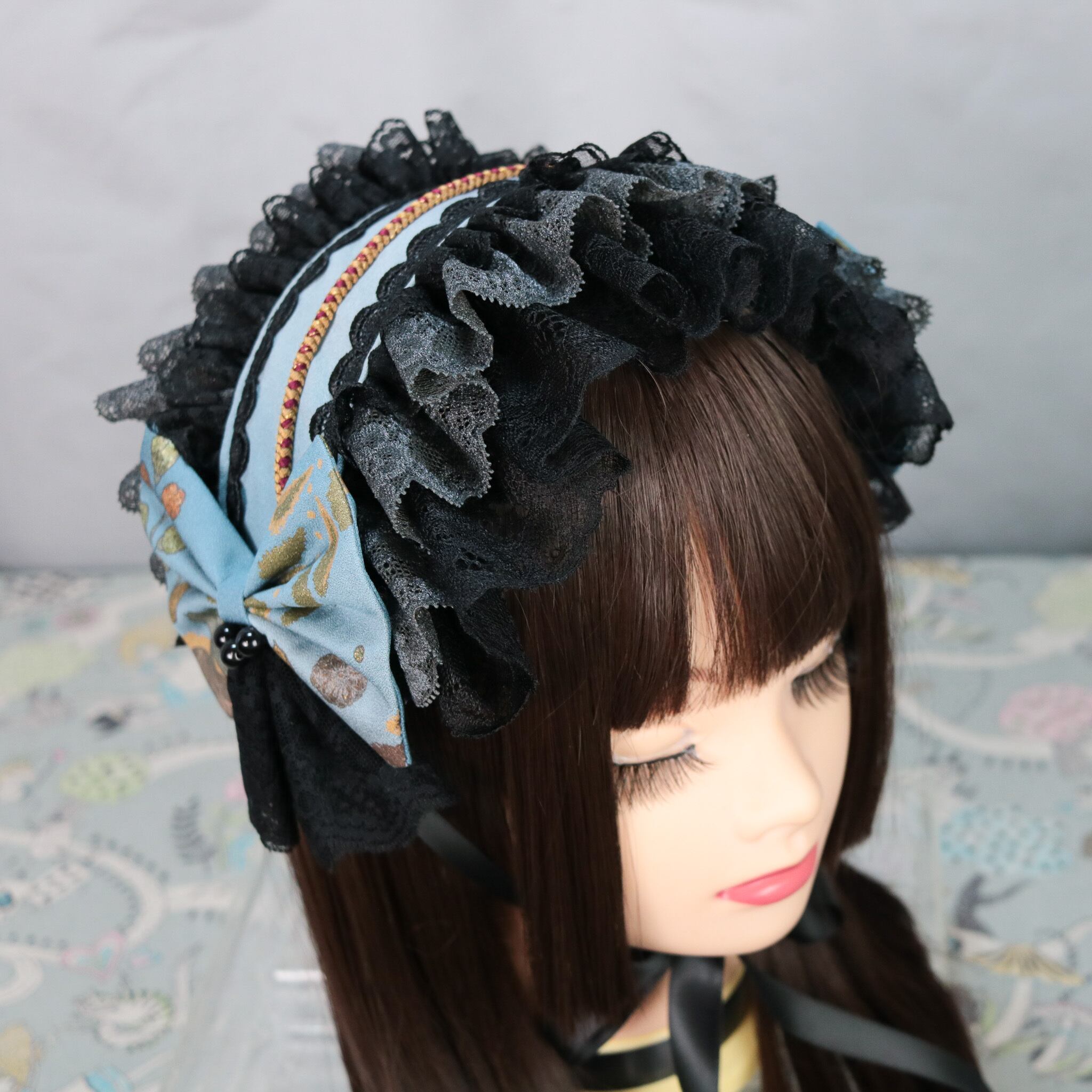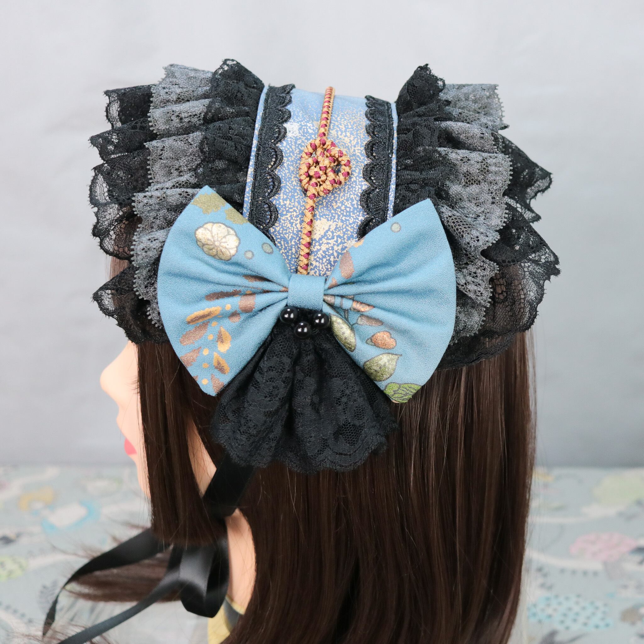 蒼友禅×帯留ブラック ヘッドドレス ロリータ 和ロリ 和ゴス 成人式 卒業式 着物